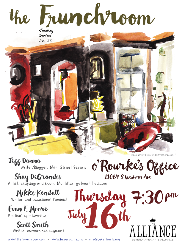 The first event was a great success and I’m hoping for more on July 16th at 7:30pm when The Frunchroom will once again be open at O’Rourke’s Office (11064 S. Western) for stories of, and by, people and places on the South Side.