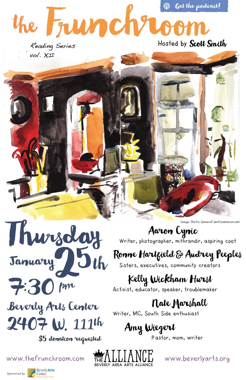 Join us Thursday, January 25th at 730pm for five new stories about, of and for The South Side of Chicago. A $5 donation is requested and goes toward the production of more great arts programs from the Beverly Area Arts Alliance.