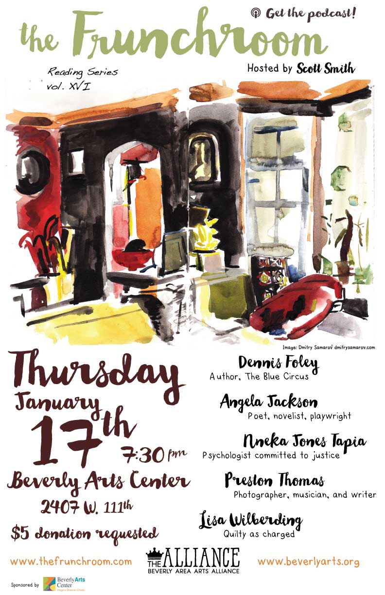 Scheduled to appear at The Frunchroom’s January show are author Dennis Foley (The Blue Circus), poet Angela Jackson (Dark Legs and Silk Kisses, All These Roads Be Luminous), psychologist and former Cook County Jail warden Nneka Jones Tapia, photographer and musician Preston Thomas and Lisa Wilberding, co-owner of The Quilter’s Trunk.